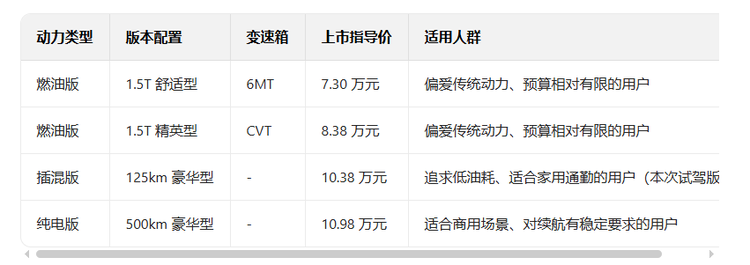 先跟大家说清楚核心的价格信息,毕竟买车先看预算。五菱星光730这次推出了三动力四版本的完整阵容,覆盖了不同用户的需求,上市指导价7.30-10.98万,性价比看着就很有诚意。具体来看,燃油版有1.5T 6MT舒适型(7.30万)和1.5T CVT精英型(8.38万)两款,适合偏爱传统动力、预算相对有限的用户;我们这次试驾的插混版是125km豪华型,指导价10.38万元;还有一款纯电500km豪华型,指导价10.98万元,更适合商用场景。