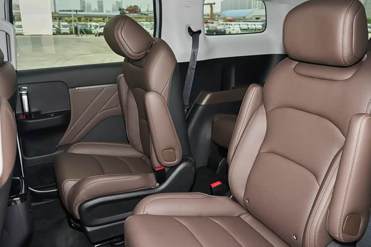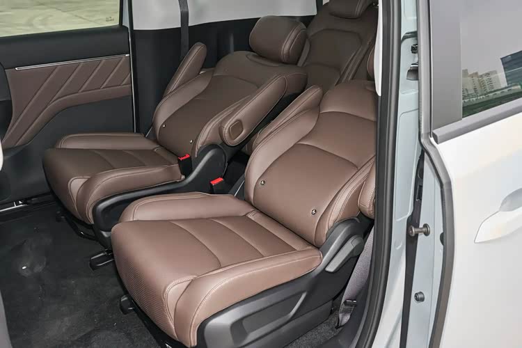 这次试驾的核心重点是插混版,毕竟它是家用场景的主力选择。坐进车内第一感受就是空间宽敞,作为一款7座MPV,空间利用率真的很关键。这款车轴距达到2910mm,这个数据在同级别车型里表现不错。它采用了2+2+3的布局,第二排是独立座椅还带双侧扶手,能前后滑动300mm,我身高175cm,坐进去调整好座椅后,腿部空间很充裕,轻松翘腿没问题。中央过道宽达230mm,平时带老人孩子出行,他们进出第三排不用侧身蜷缩,特别方便。