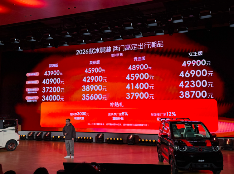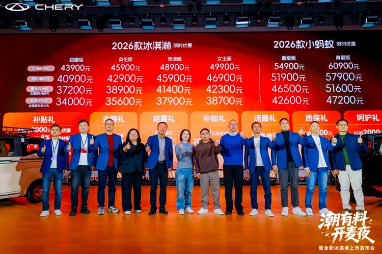 汽车说刊讯|1月10日,安徽芜湖凤鸣研创中心灯火璀璨,奇瑞汽车以一场极具年轻气息的“潮有料开麦夜”发布会,正式推出2026款奇瑞冰淇淋车型。四款个性鲜明的配置版本、低至3.4万元的实际入手价,叠加同步亮相的2026款小蚂蚁新车,奇瑞在微型纯电赛道打出组合拳,以“个性化+高性价比”双引擎,向年轻消费群体发起强势冲击。