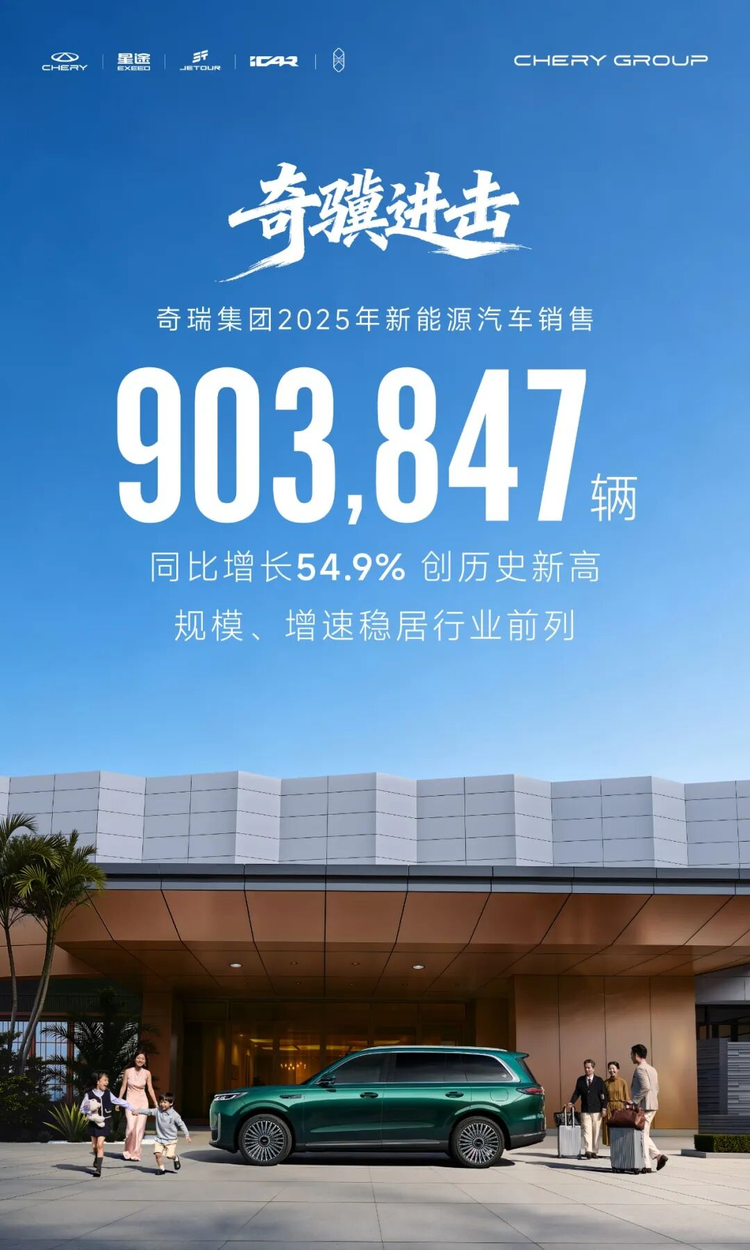 过去几年,中国新能源汽车阵营一直维持着一种微妙的平衡。但2025年,这种平衡被打破了,奇瑞新能源批发销量自11月起便正式跻身行业前三,紧贴比亚迪、吉利之后。全年累计销售更是亮眼,销售新能源汽车903,847辆,同比增长高达54.6%,无论是绝对体量还是增长动能,均已稳居行业前列。而这背后,离不开奇瑞对产品节奏和技术储备的精准把控。