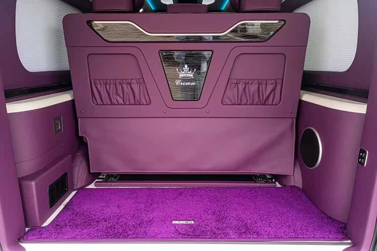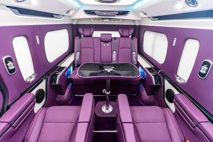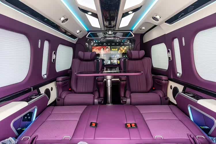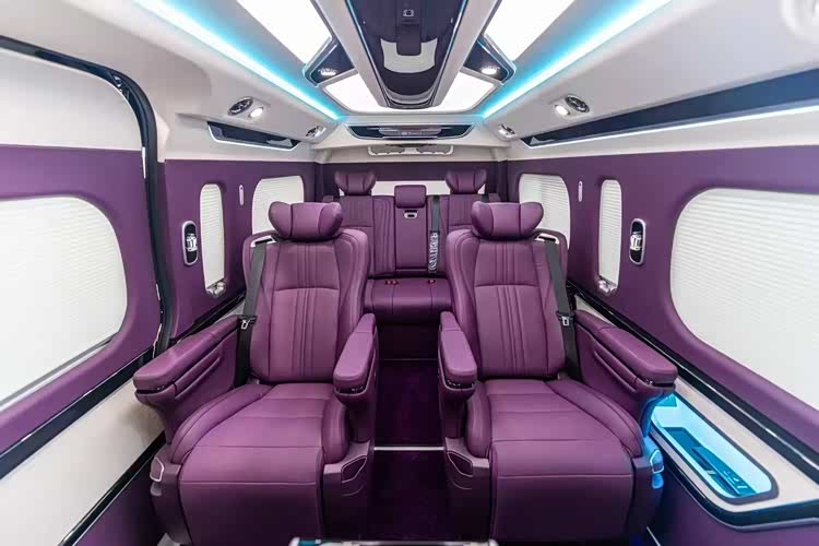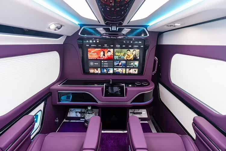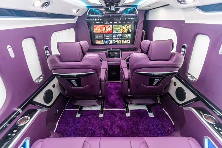 秘书桌带抽屉与多功能控制器隐藏式鞋柜、车载保险柜、雨伞柜、红酒酒柜高尔夫球具收纳区 + 行李绑带固定 氛围与舒适性营造灯光系统:车顶七色炫彩空客顶灯(遥控调节)窗帘立柱七彩LED灯(触摸屏控制)阅读灯、氛围灯带,舒缓视觉疲劳隔音降噪。
