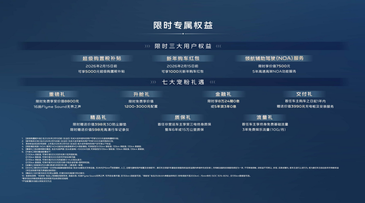 当所有这些“听劝”的升级汇聚到一款车上,再结合其极具冲击力的价格,其产品力就变得非常“可怕”。9.58万元至12.38万元的限时指导价区间,覆盖了从满足核心需求的启航版,到体验全面进阶的星舰版。而截至2026年2月15日的限时权益,如6000元超级置换补贴、7500元的5年高速高架NOA服务以及丰富的金融、精品礼遇,更是将这种高性价比推向高潮。