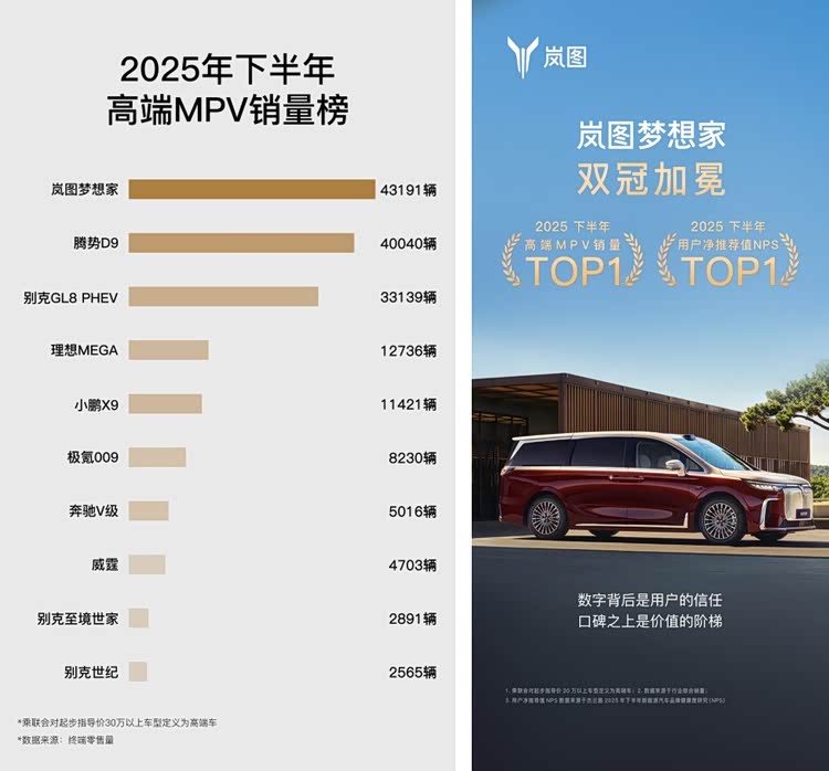 双冠背后,是岚图梦想家从“市场选择”走向“用户推崇”的关键跨越。销量领跑,印证产品经受市场严苛检验;NPS登顶,则代表其在用户心智中形成深度认同与信任。二者的结合,标志着中国高端MPV竞争进入以综合价值为导向的新阶段。