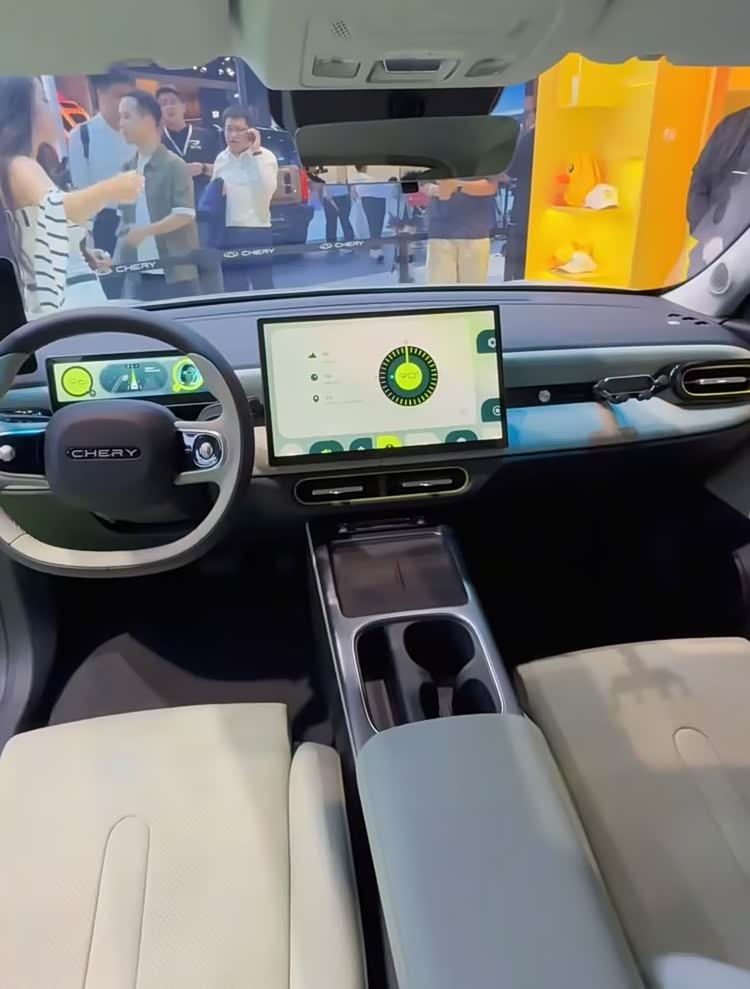 奇瑞QQ3 EV的内饰设计和配色都迎合年轻消费者的审美,中控台留有手机支架拓展孔,配备液晶仪表和15.6英寸2.5K悬浮式中控大屏,车机内置高通骁龙81556芯片,支持手机互联和映射、多场景模式、还融入了AI语音大模型。