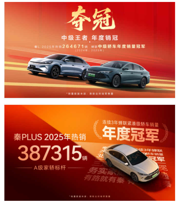 近日,乘联会2025年度乘用车销量榜单发布,秦家族包揽两大细分市场年度冠军:秦PLUS以387,315辆的销量成绩登顶紧凑级轿车市场年度销量冠军,秦L则以264,671辆的成绩问鼎中级轿车市场年度销量冠军。在双冠王的荣耀加持下,秦家族同步推出2026款秦L DM-i 210KM长续航版与2026款秦PLUS DM-i 210KM长续航版,售价8.98-12.28万元,以"4个2+3个C"核心技术优势重新定义家轿价值标准。