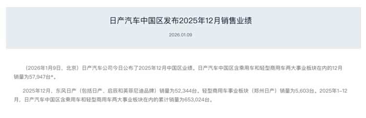 数据显示,2025年全年日产汽车中国区含乘用车和轻型商用车两大事业板块在内的累计销量为653024辆,与去年同期的696631辆相比下滑6.26%。