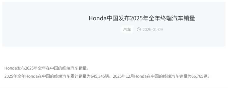 数据显示,2025年全年本田中国终端汽车累计销量为645345辆,同比下滑24.28%。从具体车型来看,雅阁、CR-V依旧“能打”,月销量仍可以稳定保持在万辆以上,相比之下 曾经的一代“神车”思域则是掉落神坛,目前月销量只能维持在4-5000辆。而让本田仍在销量下滑的泥潭中挣扎的最主要原因则是其新能源转型的受阻。