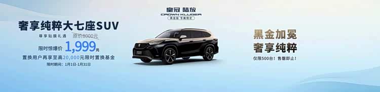 · 旗舰典范皇冠陆放:也特别推出黑金版尊享贴膜礼遇。价值8000元的原厂高品质隔热膜,限时专属秒杀价仅1999元,限量前500名订车用户,先到先得。同时,在1月1日到1月31日期间置换的用户,额外再享至高2万元限时置换基金。