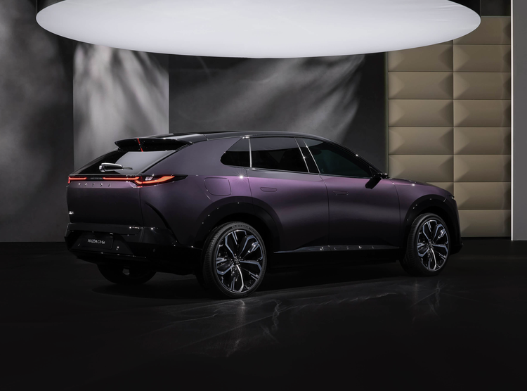 马自达CX-6e的车身采用了轿跑式轮廓,倾斜的黑色A柱与弧线形的车顶一气呵成,并与黑色加宽的B柱/C柱、黑色的车窗装饰边框巧妙地融为一体,形成了悬浮式车顶的立体效果。车身加入了灵动、妖娆的腰线设计,四个隐藏式的门把手和四个无边框车门的加入,黑色宽大的侧裙与前后拱形的轮眉连接在一起,还配备了21英寸的多辐式锻造轮圈,匹配了255/40 R21米其林竞驰4 SUV轮胎,内置红色制动卡钳罩,还配备了硕大的黑色倒车镜外壳。整车更加激进、运动。车身尺寸方面,马自达CX-6e长宽高分别为4850/1935/1620毫米,轴距2902毫米,车内采用了标准的5座布局。