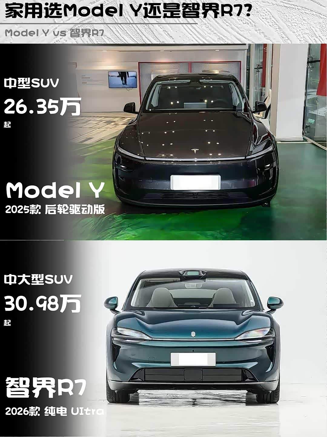 最近身边好几个朋友都在纠结选特斯拉Model Y还是 智界R7(参数|询价),作为两款30万级纯电SUV的热门选手,今天就从真实用车角度给大家盘一盘这两台车的差异!🚗💨