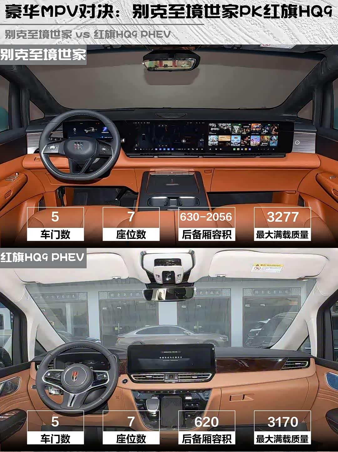 再看红旗HQ9 PHEV,国车气场这块拿捏得死死的!🚩 直瀑式格栅+红色旗标,开出去接待客户倍儿有面。2.0T插混系统综合功率300kW,扭矩高达820N·m,7.7秒破百比别克稍慢,但Nappa真皮+胡桃木内饰的"中式豪华"确实独特。二排航空座椅支持173°平躺,带20向气动按摩,比别克多了丹拿音响和升降茶台,商务仪式感无敌!