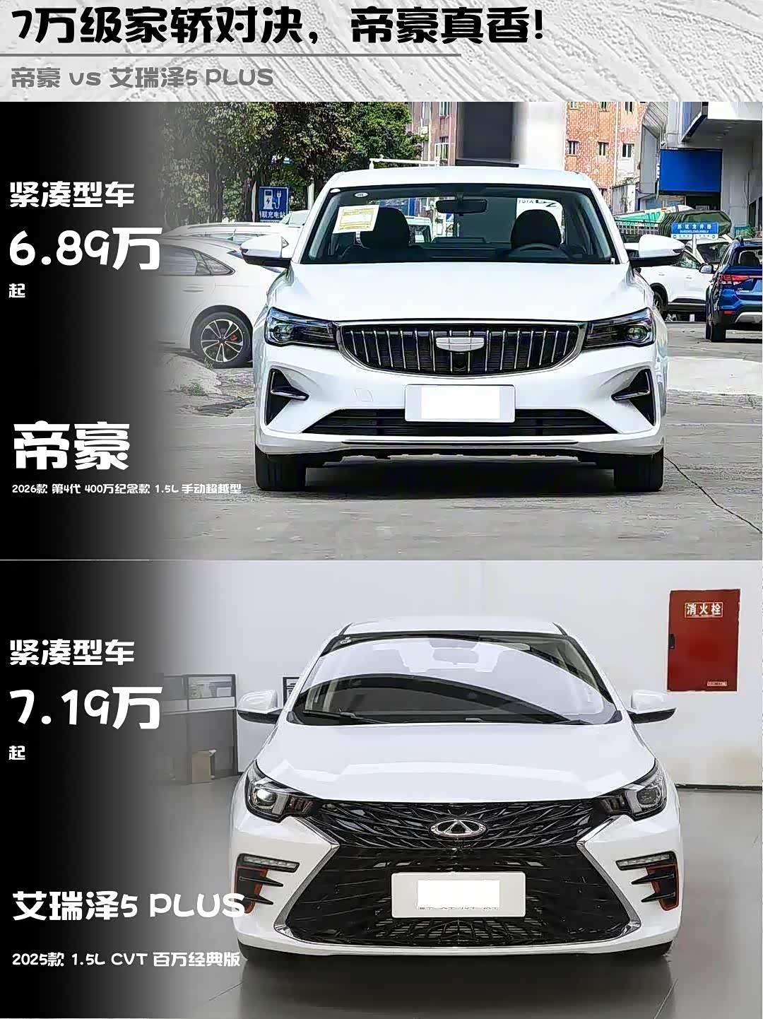 最近在选10万内的家轿,纠结帝豪2026款 第4代 400万纪念款 1.5L 手动超越型和 艾瑞泽5 PLUS(参数|询价) 2025款 1.5L CVT 百万经典版,深度试驾后掏心窝子分享对比干货!🔥