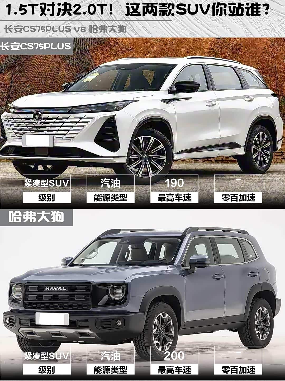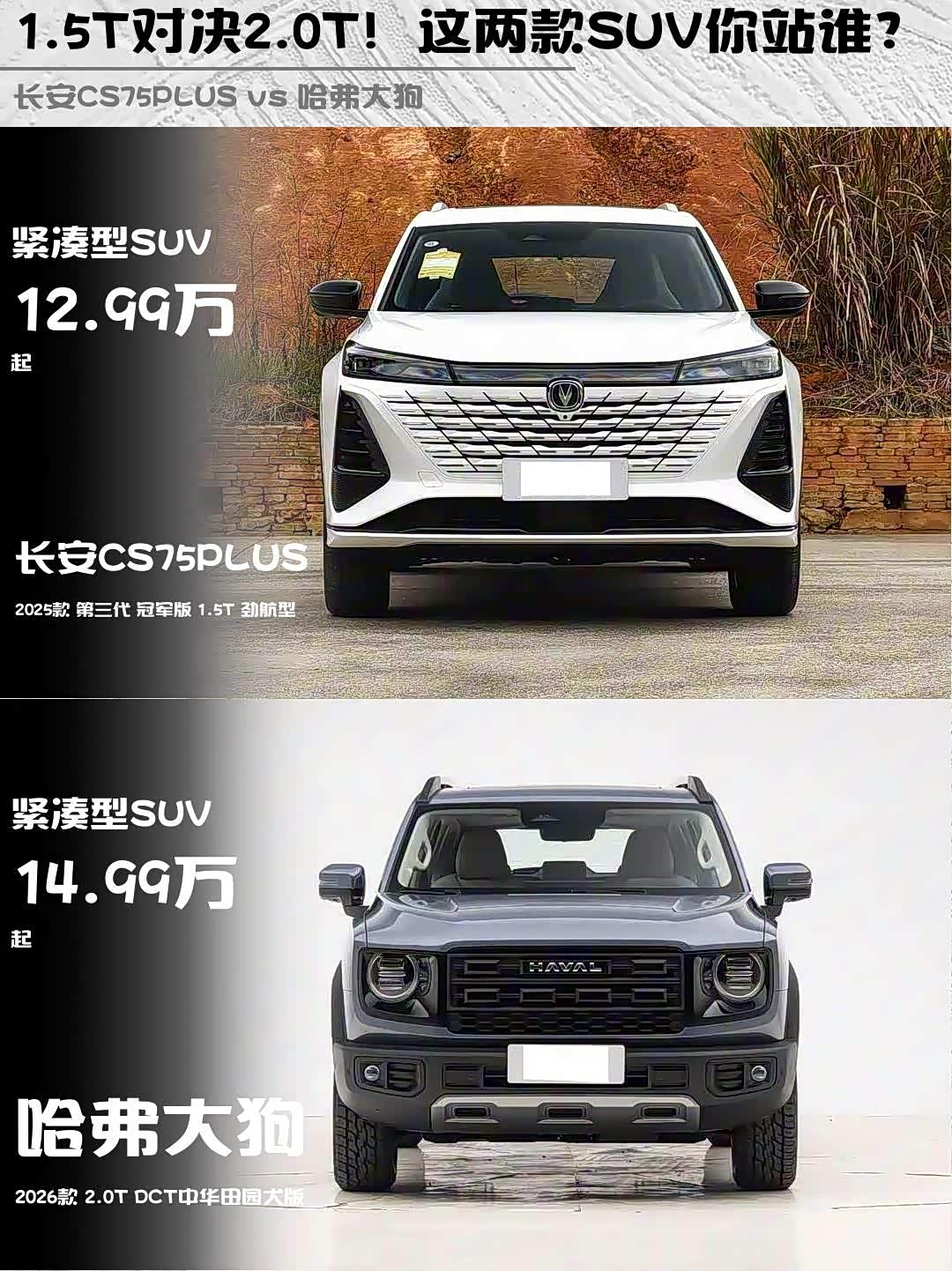 最近在选15万级SUV的朋友看过来!今天深度对比两款热门车型—— 长安CS75PLUS(参数|询价) 2025款第三代冠军版1.5T劲航型(12.99万)和哈弗大狗2026款2.0T中华田园犬版(14.99万),看完这篇你就知道怎么选了!🔥