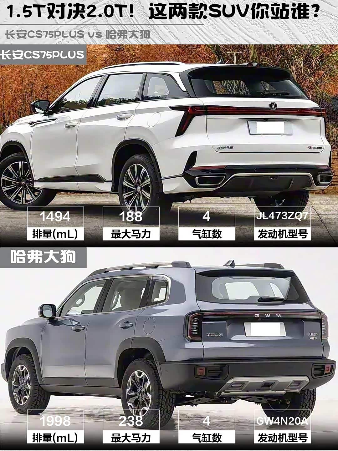 CS75PLUS后备厢620L碾压大狗的496L,后排座椅放倒能当1.8米大床!实测后排可以跷二郎腿,纯平地台三人坐不挤。大狗方盒子造型牺牲了后备箱,但坐姿更高视野好,副驾越野扶手超有范儿。要家用选CS75PLUS,要硬派feel选大狗~
