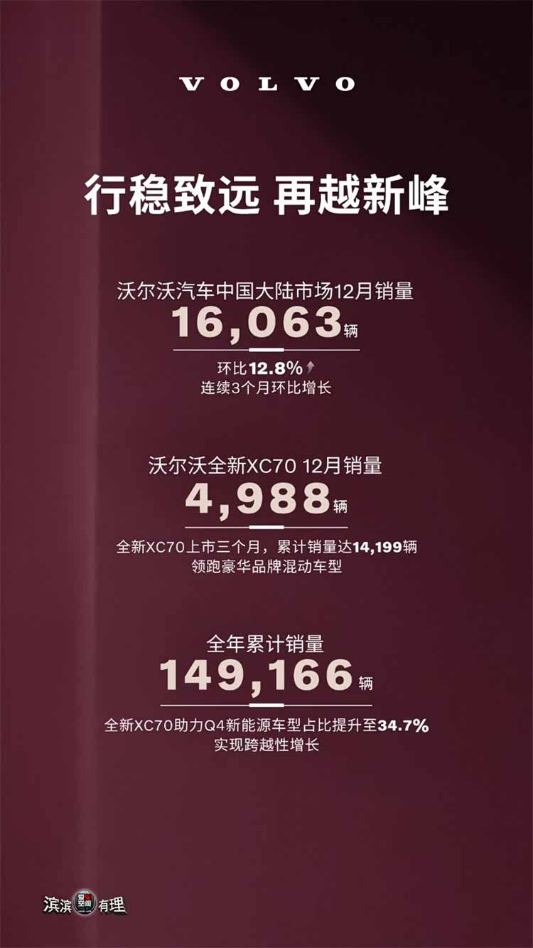 沃尔沃汽车始终致力于推动可持续发展,积极推动电气化转型。自XC70上市以来,第四季度沃尔沃新能源车型销量达到15,328辆,占比达到34.7%,实现跨越性增长。