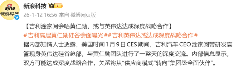 2026年1月12日消息,据多家媒体报道,美国时间1月9日国际消费电子展(CES)举办期间,吉利汽车集团CEO淦家阅率研发高管团队到访英伟达硅谷总部,与英伟达创始人黄仁勋团队举行了长达一日的闭门会晤。据内部知情人士披露,此次会面并非单纯的礼节性造访,标志着双方合作关系将从传统的“供应商模式”,升级为更深度的“集团级全面伙伴关系”。
