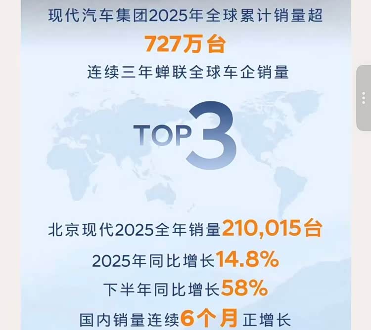 悦达起亚表示:连续10个月单月销量破2万台,全年销量同比增长2.3%,北京现代则是:同比增长14.8%,25年下半年增长58%。