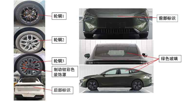 可见配置部分,有18寸和19寸两种型号轮毂,三种样式轮毂带一种橙色制动钳装饰罩,车尾多字母标识,后排及车尾绿色玻璃。