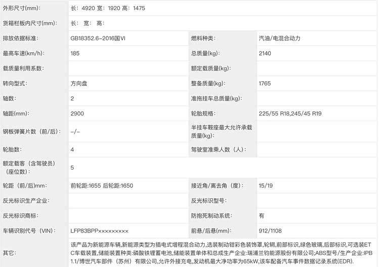 此次亮相的增程版,申报图且含配置信息图,和之前纯电版的完全相同。长宽高分别为4920/1920/1475mm,轴距为2900mm,也和纯电版之前公开的数据完全相同。