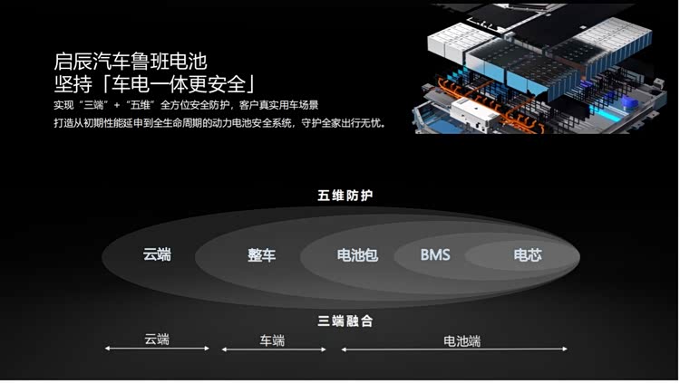 电池安全方面,2026款启辰大V DD-i虎鲸搭载启辰汽车鲁班电池2.0,执行高安全标准和高安全结构,实现车电一体大安全。通过5大高标准安全检验,包括电池整包针刺不起火不爆炸、1.4倍国标耐久振动不散架、1.2倍国标挤压不怕撞、5米高度跌落不爆炸、IPX9K高温高压不惧喷淋,树立了电池安全新标杆;并采用高强度钢蜂窝结构和双独立BLOCK腔体设计,电芯高度集成,提高电池包空间利用率和能量密度,极端情况下,可以延缓及阻隔电芯间的热失控传递,实现整包无热蔓延的超高安全性,确保乘员安全。