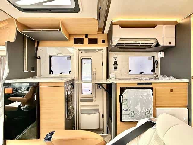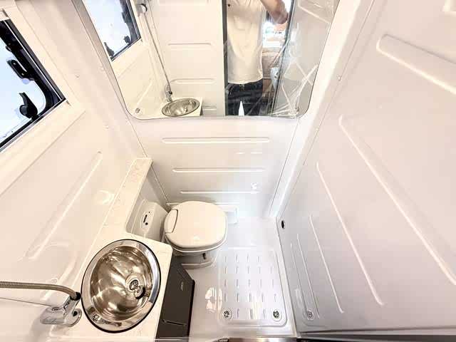 • 厨卫系统:配备电磁炉、柴油灶、微波炉、洗烘一体机及两个房车专用冰箱,满足烹饪与储物需求。卫生间采用高光吸塑ABS防水总成,配备盒式马桶、淋浴器及双地漏,实现防水、防臭、防霉变、通风的一体化设计。