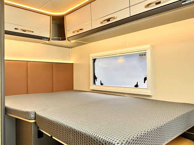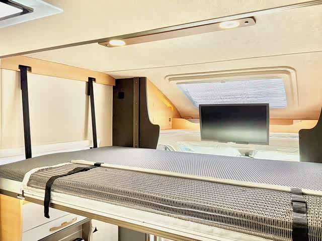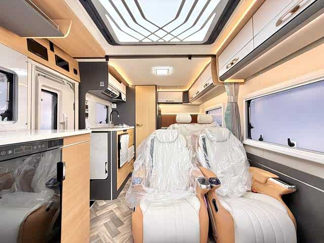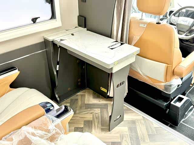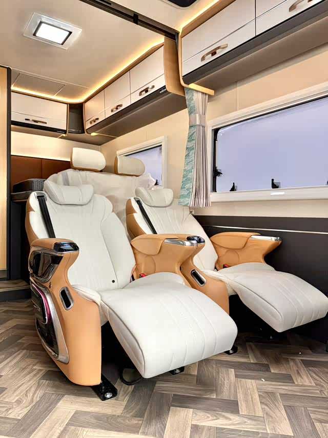 车内采用4-6人座椅布局,主打航空座椅(支持通风、加热、按摩)与乘用车调节滑动座椅,兼顾商务接待的豪华感与长途旅行的舒适性。睡眠区设计尤为巧妙:后置纵床(1.17×1.9m)可伸缩,搭配一键电动升降床(2.08×1.2m),轻松满足多人住宿需求。E0级环保家具板材、进口地板革以及“云之羽”商务顶灯/氛围灯,营造出高雅且健康的车内环境。