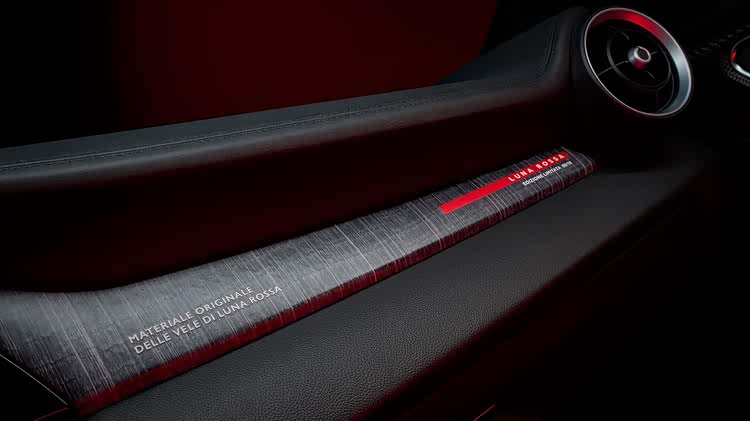 在内饰中,诸多设计同样向“Luna Rossa”赛艇致敬。Sparco运动座椅的面料灵感来自赛艇上的救生衣。仪表台饰板中还嵌入了一层极薄的薄膜,其材质与“Luna Rossa”帆布的一层材料相同。此外,还配备了更多裸露碳纤维饰件,以及中控台上的“Luna Rossa”字样标识。