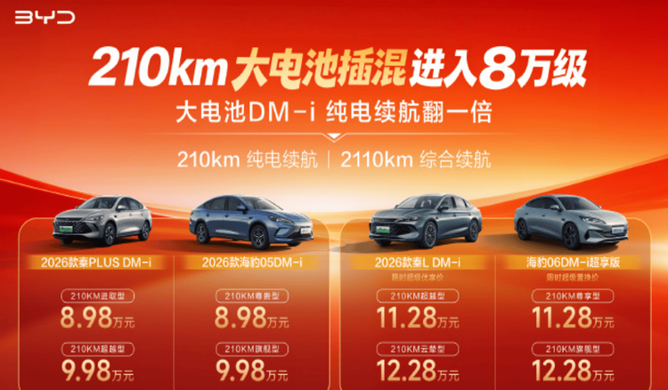 比亚迪此次直接放出“王炸”,秦PLUS DM-i、秦L DM-i、 海豹05 DM-i(参数|询价)、海豹06 DM-i四款热门混动车型同步升级,全系搭载25.28kWh大容量插混专用刀片电池,CLTC纯电续航均突破210km,综合续航更是飙升至2110km。其中秦PLUS DM-i 8.98万起售,首次将200km+纯电续航门槛拉进8万级,日常通勤每公里成本仅0.2元,日均40km通勤一周充一次电即可,彻底告别频繁补能。