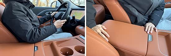 评测车前排中央扶手为上掀式设计,面积宽大,并采用皮质包裹,触摸手感不错。虽然不支持位置调节,但在驾驶过程中还是能够对于驾驶者的手肘起到支撑作用。