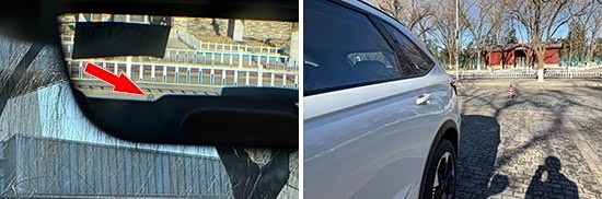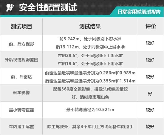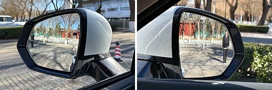 评测车左、右外后视镜均采用普通镜片。经实测,左、右外后视镜视野范围分别为29.5°和19.6°,分别处于同级别中上游和同级别中下游水准。