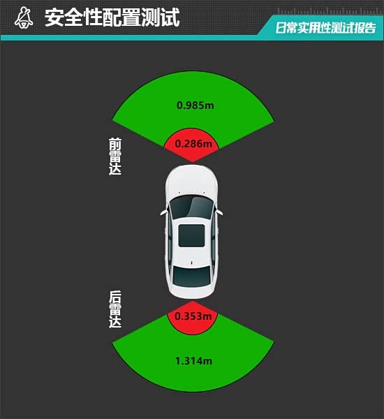 前驻车雷达最远可在0.985m处感应到前方物体,雷达功率表现比较出色,最近端提示距离为0.286m,处于同级别中下游水准。