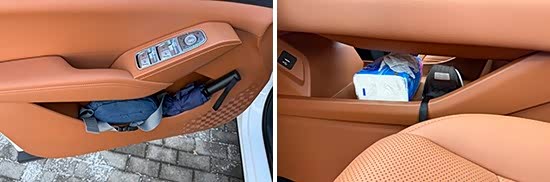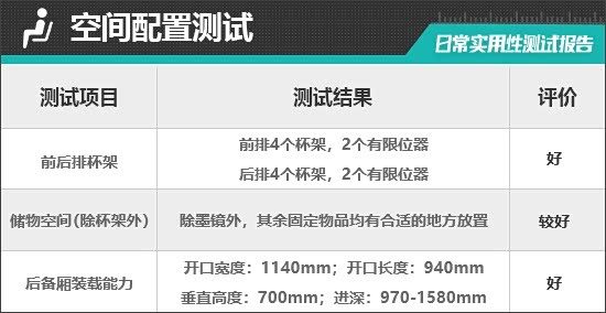 对于车内使用空间的测试,只针对前排触手可及的空间,不包括手套箱、中央扶手箱等需开启的空间。测试方法是将以下固定物品全部放置在前排的各个储物空间内,通过固定物品的放置情况来判断车辆储物空间的表现。测试选定的固定物品为:2瓶常规大小的矿泉水、1部大屏手机、1支口红、1个挎包、1副墨镜、1把折叠雨伞以及1包常规尺寸的抽纸。