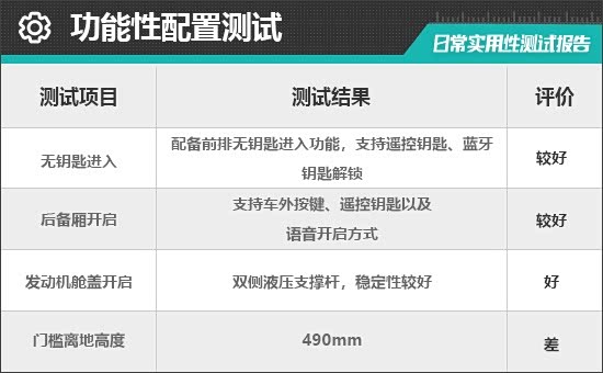 对于消费者来说,门槛离地高度一定程度上决定了上下车便利性。根据实测结果来看,评测车的门槛离地高度为490mm,驾乘人员日常上下车稍显不便。