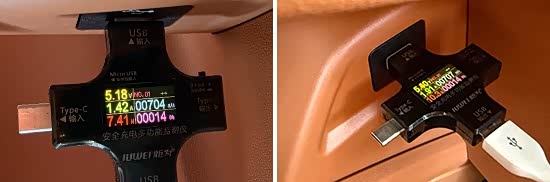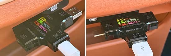在车内USB接口方面,评测车前排配备2个USB Type-A接口,后排配备1个USB Type-A和1个USB Type-C接口。同时,后备厢提供1个12V电源,便利性不错。此外,我们对USB接口的电压、电流、充电功率进行了测试,其中前排左侧USB Type-A接口的电压、电流、充电功率分别为5.2V、1.4A、7.4W左右,前排右侧USB Type-A接口的电压、电流、充电功率分别达到5.4V、1.9A、10.3W左右;后排USB Type-A接口的电压、电流、充电功率分别达到5.1V、0.5A、2.7W左右,后排USB Type-C接口的电压、电流、充电功率分别达到5V、1.9A、9.6W左右。