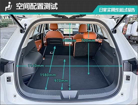 对于评测车后备厢的基础数值,我们也进行了实测,开口长度为940mm;开口宽度为1140mm;后备厢进深为970-1580mm;后备厢地台与顶部的垂直高度为700mm。
