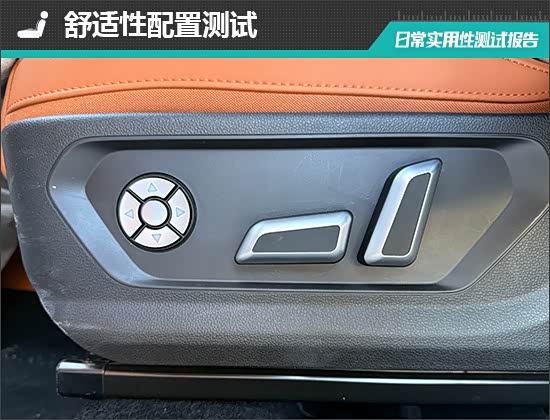 座椅方面,评测车前排座椅调节按键位于座垫侧面,调节按键位置合理,操作便捷。同时,评测车前排座椅提供加热、通风、按摩功能,后排座椅支持加热功能,舒适性表现可圈可点。