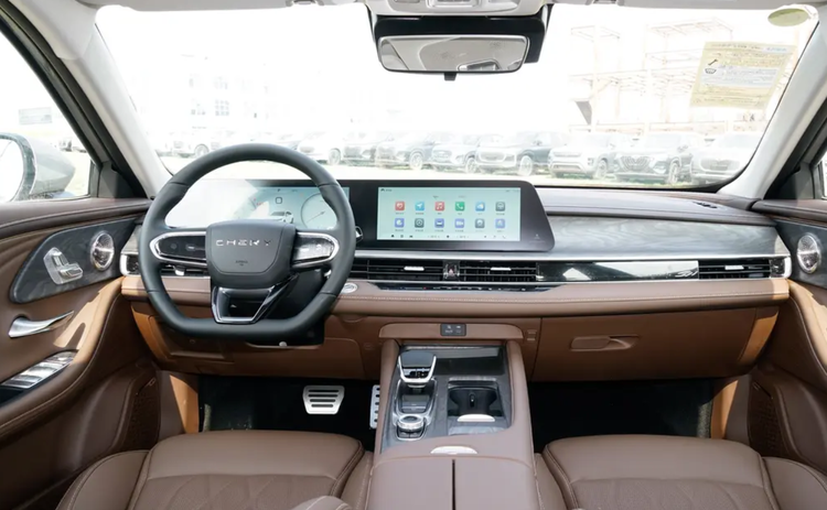 来到内饰,艾瑞泽8的豪华不仅体现在外观部分,更多是内饰的用料,它虽然延续家族式风格的布局,但质感还是很高级。中控前方采用拉丝面板与车门处相结合,贯穿式空调出风口也采用了烤漆装饰板。可以说内饰营造的豪华感堪比奔驰。但它也保留有电子换挡机构,前排水杯架和前排无线充,以及双开门的扶手箱。棕色座椅皮革增添了内饰商务感,座椅采用高回弹海绵,所以乘坐质感挺柔软的。而且双联屏是由10.25英寸+12.3英寸的组合,APP的支持极为丰富,还能语音唤醒和控制,远程监测和胎压查看。