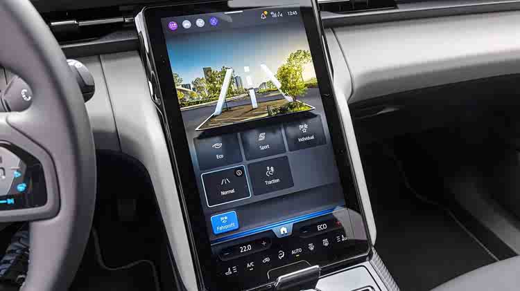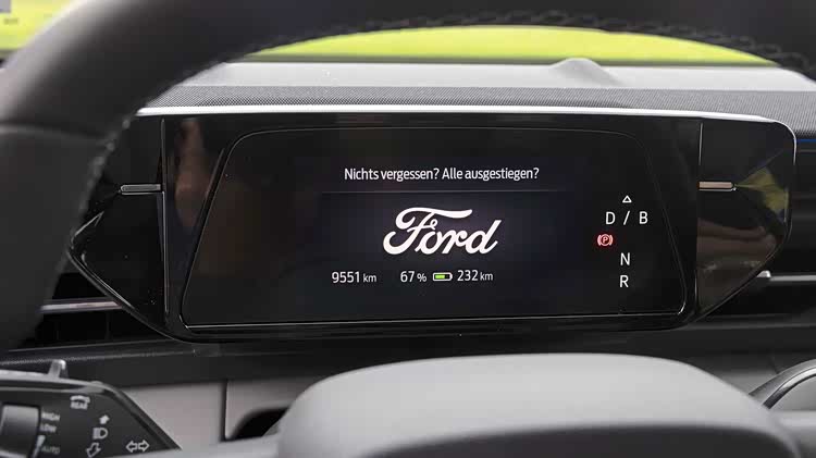 从内饰来看,新车与大众MEB兄弟车型的相似之处比外观更明显。方向盘后的仪表屏幕,或其右侧用于选择挡位的旋钮,都显得相当眼熟。不过,福特依然在细节上加入了自己的想法。例如那块可调角度的纵向中控屏,其后方隐藏着一个小型储物格。这一设计既新颖,又非常实用。