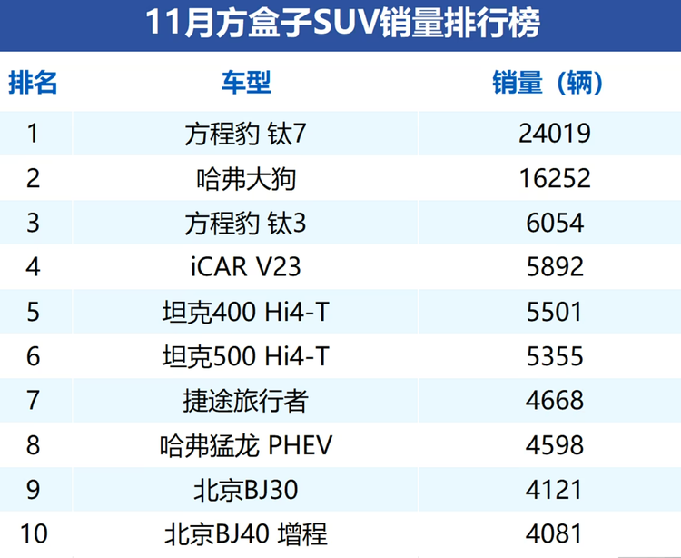 对比一下11月的销量榜单,会发现12月的方盒子市场堪称“大换血”,除了方程豹钛7和哈弗大狗稳如泰山守住了冠亚军宝座,其他车型排名均有了大变化。随着2026年的到来,价格战与产品战只会更加白热化,方盒子市场的格局或许还会经历更剧烈的震荡,那么在这场激烈的排位赛中,哪款车的销量表现最让你感到意外?