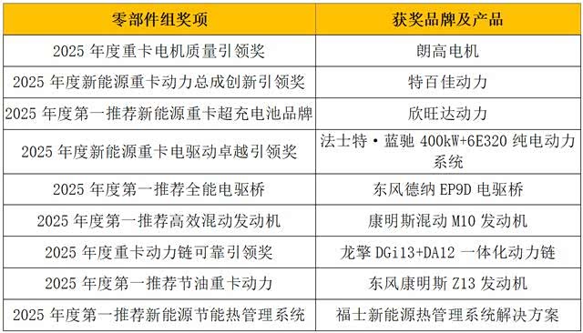 同时,为加速商用车行业绿色化、高效化与低碳化转型进程,零部件组评选紧扣行业发展趋势及核心需求,聚焦动力系统、核心总成等关键领域,针对性地设立了“2025年度新能源重卡动力总成创新引领奖”、“2025年度重卡电机质量引领奖”、“2025年度新能源重卡电驱动卓越引领奖”等年度奖项,全方位覆盖产业链关键环节。