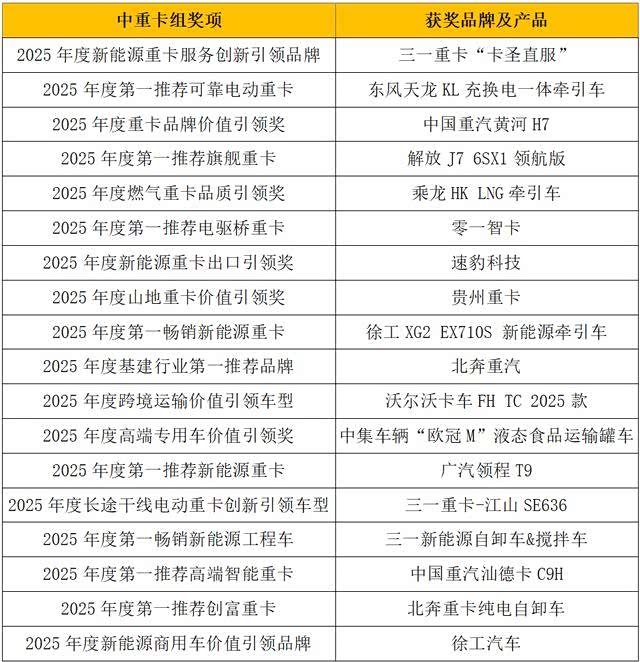 中重卡组获奖品牌及产品