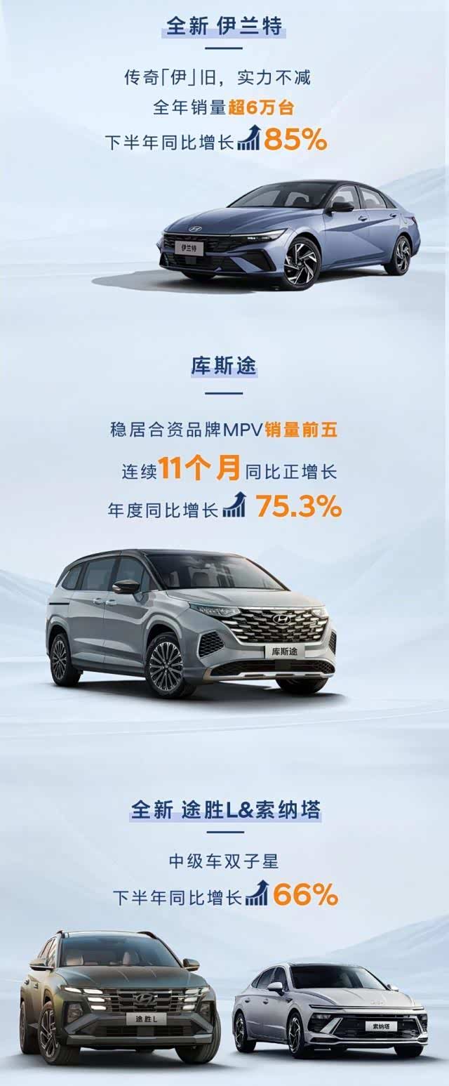 燃油车是“压舱石”, 库斯途(参数|询价)稳居合资MPV销量前五,在20万级家用MPV市场,它成了唯一能与奥德赛、GL8较量的韩系选手;家轿“担当”全新伊兰特,全年销量超6万台,下半年同比增长85%;索纳塔与途胜组成的"中级车双子星",下半年销量同比激增66%,证明其在核心燃油车市场依然拥有强大的产品力和用户认可度。