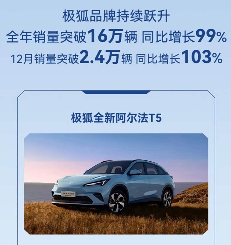 先来回顾一下极狐的成绩单:2024全年累计销量超8万台,同比增长170%。2025上半年销量5.5万辆,同比增长超过200%。去年下半年,极狐更是迎来爆发式增长:9月售出1.6万辆,10月-12月连续月销稳定在2万+。至此,2025全年,极狐销量超过了16万辆,同比增长99%,成为年度增长最快、势头最猛的品牌之一。