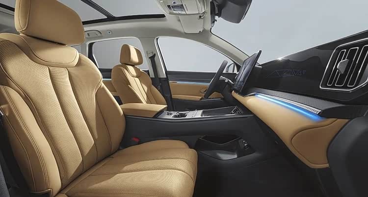 内饰部分,新车定位更高端,注重舒适与便捷。座舱提供前排座椅多向调节、加热/通风功能,高配车型配备HUD抬头显示、前排50W手机无线充电、驾驶位电动调节、车内氛围灯、分区空调和车载冷暖冰箱等配置,进一步提升了舒适度与豪华感。此外,新车搭载最大15.6英寸中控屏,支持HiCar、双区语音控制、连续识别、手机控车、车载KTV、DeepSeek接入,配备L2级天神之眼C辅助驾驶(DiPilot 100),具备高快领航、泊车辅助等功能。