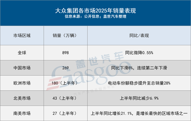 2025年对大众汽车集团而言,是在挑战中寻求平衡的一年。根据大众集团2025年业绩报告,其全球交付新车超898万辆,相比2024年的903万辆同比微降0.55%。值得注意的是,纯电动汽车交付量增长显著,达到约98.31万辆,实现同比增长32%,使得纯电动车型在全球销量中的占比提升至10.9%,相比2024年增加了2.7个百分点。