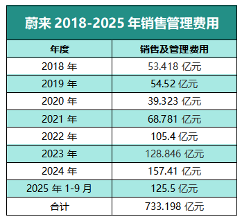 11年来,蔚来累计研发投入超过650亿元,远超其他新势力,充换电基础设施建设累计投入也超过180亿元。销售与管理费用更是惊人,自2022年以来,蔚来每年的这项支出都超过100亿元,2018年至2025年第三季度累计支出高达733.2亿元,比研发投入还高。