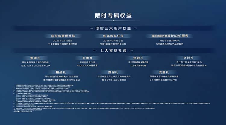 价格与权益的诚意,进一步降低了“全能”的门槛。星舰7 EMi提供130km启航版(9.58万)到135km星舰版(12.38万)四个版型,入门即标配Flyme Auto座舱、6安全气囊、神盾电池;2026年2月15日前下定,还可享5000元超级购置税补贴、7500元NOA服务权益,以及8万24期0息、免费充电桩等七大宠粉礼遇,真正实现“入门即高配”。
