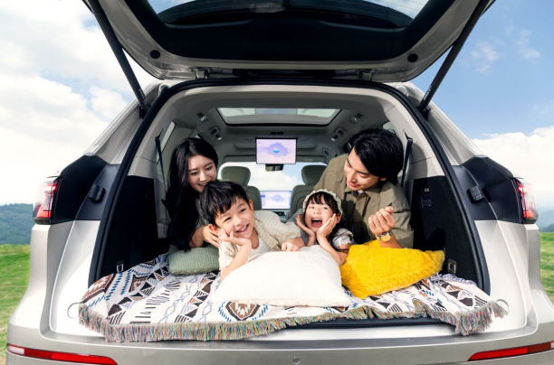 家庭出行的核心需求,往往藏在一个个具体场景里。日常通勤时,孩子的书包、老人的保温杯、家长的通勤包,总需要足够多的收纳空间,银河M9的21处储物设计恰好解决了这一痛点,从门板杯架到中央扶手箱,零碎物品各得其所。周末带娃去公园露营,359L的基础后备箱能轻松装下6个20寸行李箱,若还需携带帐篷、折叠椅等大件装备,只需一键放倒二三排座椅,立刻拓展出2171L的超大空间,儿童推车、露营箱甚至充气床垫都能稳妥收纳,再也不用为“装不下”发愁。