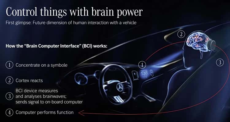 这一切不再是科幻,一汽申请了一项名为 “基于生物—物理耦合的车辆控制方法”的技术专利,这项专利描绘了一幅图景:驾驶员只需戴上轻盈的非侵入式设备,类似智能头带或耳机,车辆便能精准捕捉其意图,除了一汽,奔驰也在此前发布过类似技术的概念车。