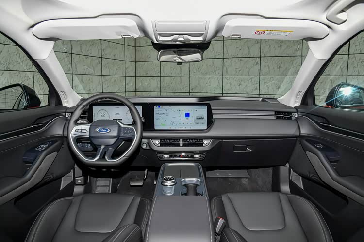 内饰方面的用料很厚道,中控台和车门内饰板都用皮革包裹,为车内营造出豪华车的氛围感,12.3英寸全液晶仪表和13.2英寸的中控屏幕连接在一起,两块屏幕的分辨率都很高,显示的画面也很清晰,中控屏支持手机互联和导航功能,在同级车型中达到了平均水平,电子式旋钮换挡机构用起来很方便,在前排还配备了手机无线充电功能,算是一项与时俱进的配置。